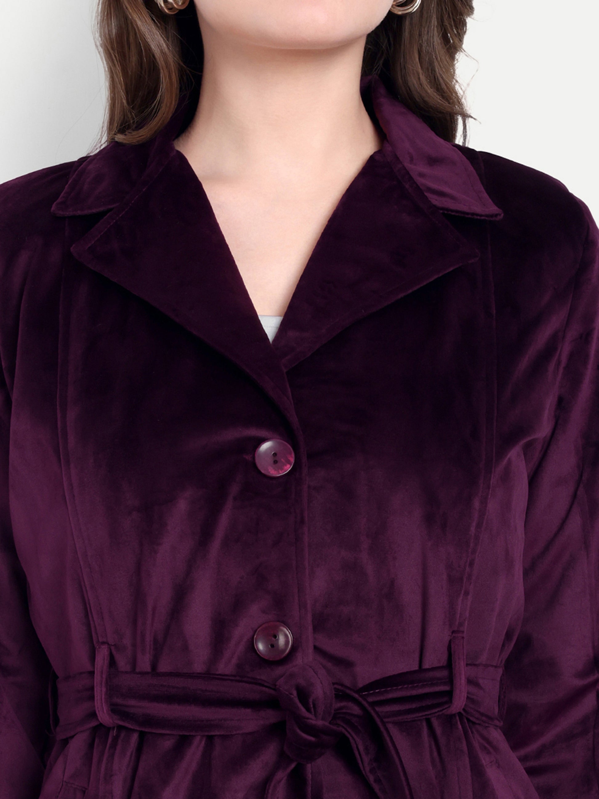 Excent Women’s Velvet Long Coat – Elegant Belted Winter Jacket in Purple| Premium Soft Velvet Overcoat for Women
